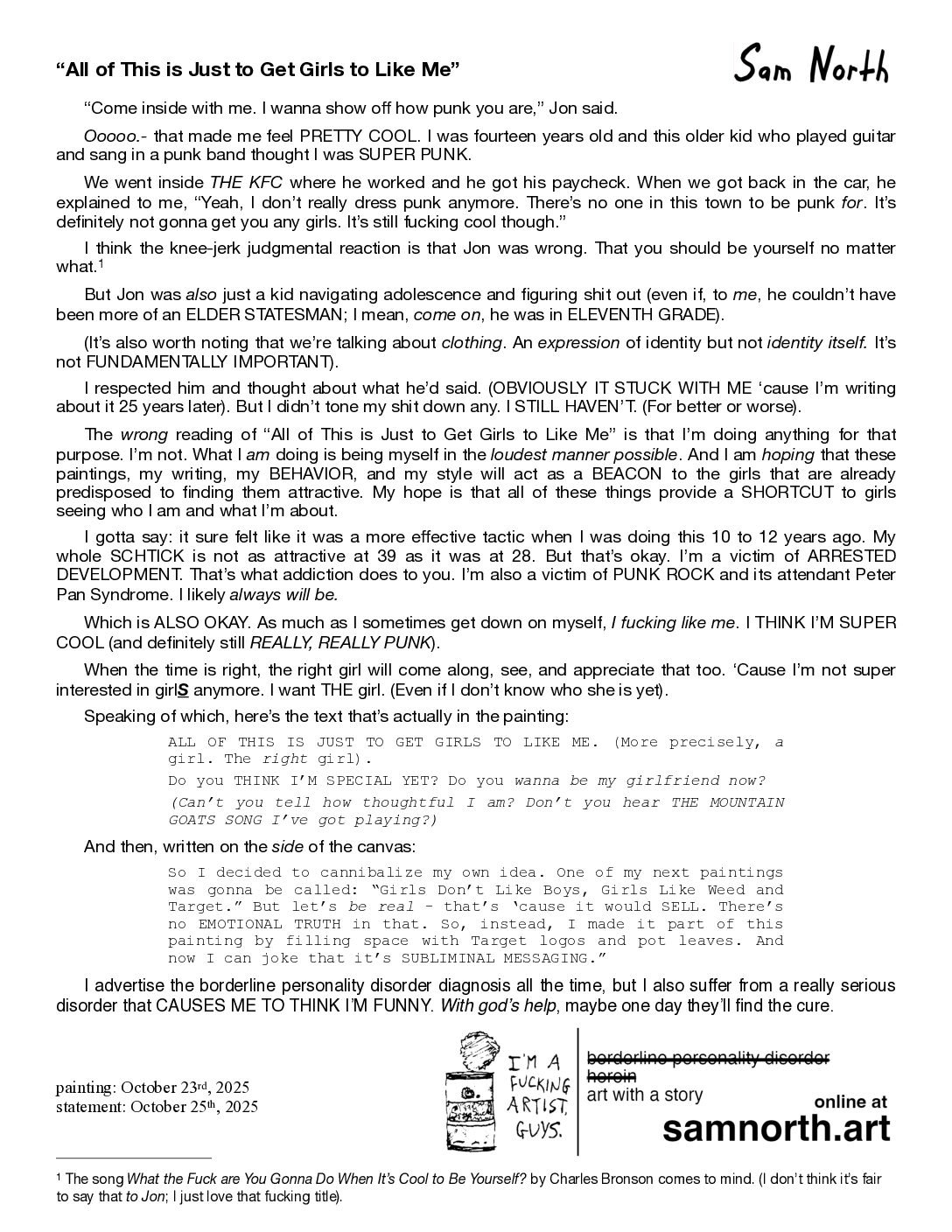 “All of This is Just to Get Girls to Like Me” is a 24×36-inch acrylic painting, created by artist Sammy thrashLife in October 2025, in Savannah, Greenville, and Tampa. It was originally featured in his blog entry for November 18th, 2025.
